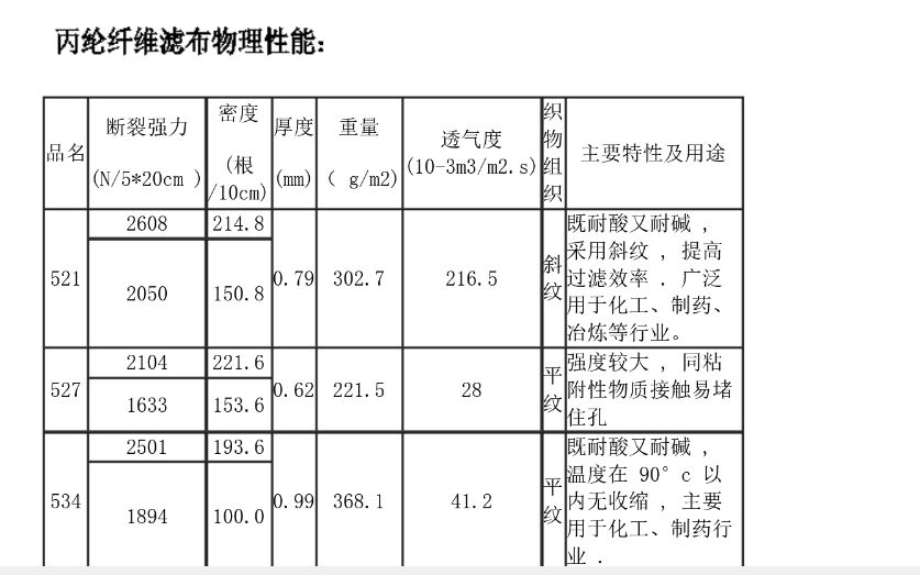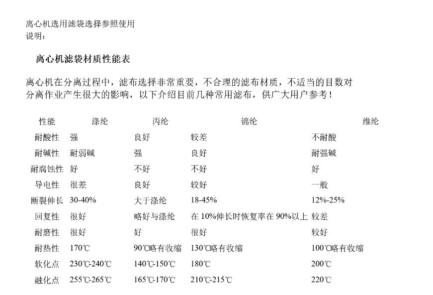 丙綸離心機濾袋 工業(yè)固體分離耐高溫酸堿 離心機 濾袋濾 丙綸短纖維,纖維短,紡成的紗線帶毛。丙綸長纖維,纖維長,形成的紗線光滑, 所以丙綸長纖維比短纖維斷裂強度高,透氣性能好。由丙綸短纖維織造成的工業(yè)用布, 布面帶毛,粉未過濾墟和壓力過濾效果均比長纖維好。而丙綸長纖維織造成的 工業(yè)用布,布面光滑,透氣性能好,適合粉未過濾。是化工制藥等企業(yè)的最好過濾材料, 但不適合粉未過濾。 丙綸纖維濾布物理性能: