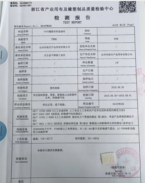 高溫除塵布袋廠家PTFE濾袋工業針刺氈聚四氟乙烯除塵器袋覆膜PTFE Needle Felt (ptfe 覆膜針刺氈) Fiber(基布) 100% PTFE Weight(克重) 750 g/m2 material(材質) 100%ptfe Air premeability(透氣量) 20-35 L/m2/s Warp Tensile Strength(斷裂強度徑向) 1100N/5X20cm Weft Tensile Strength 斷裂強度/緯向 1400N/5X20cm After Treatment(后處理方式) PTFE membrance,PTFE dipping Continue Working Temperature(連續工作溫度) 240℃ Max. Working Temperature (瞬間工作溫度 ) 280℃ Chemical Properties(耐酸堿性) Anti-acid (耐酸性) Excellent (優) Anti-alkali(耐堿性) Excellent(優) Anti-oxidative (耐氧化性) Excellent(優) The above datas are for reference only, all the the right for the final explanation reserved by aizhou Haotian Industrial Fabrie Co.,Ltd