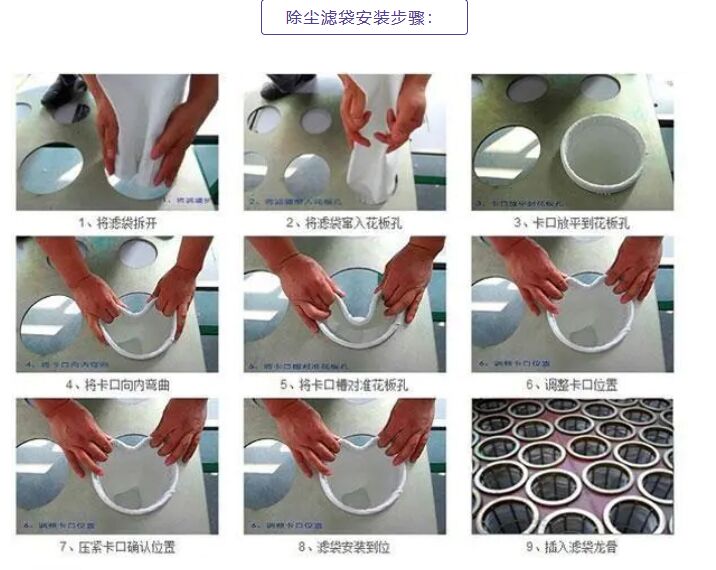 濾袋安裝前要避免有損壞情況,所有濾袋的接縫都應(yīng)朝向同一方向即背對(duì)進(jìn)氣口。